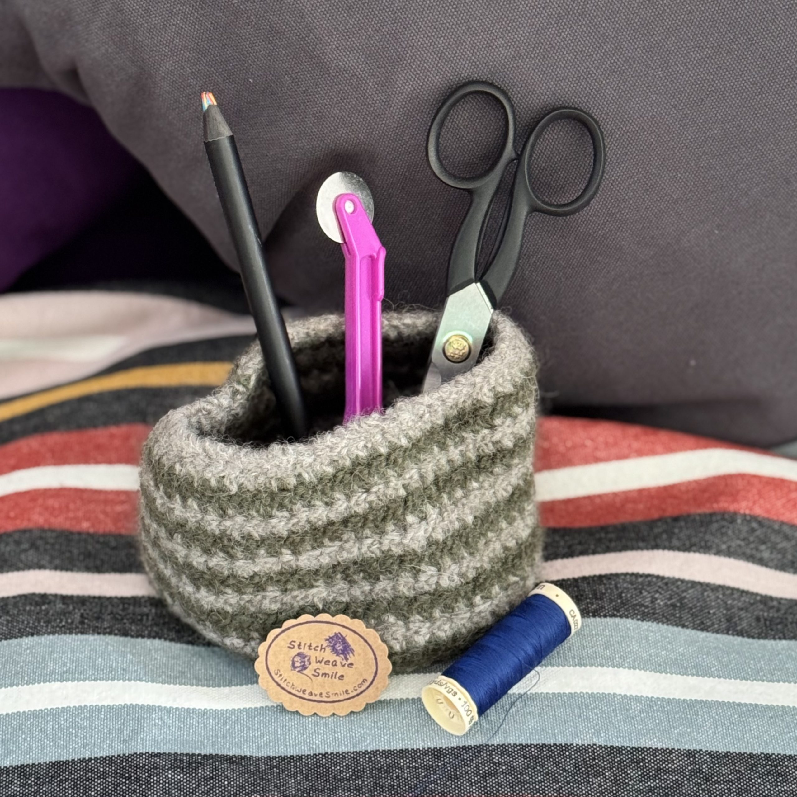 Filzkorb aus gehäkelter Wolle, ideal für die Aufbewahrung von Strick- und Häkelzeug. Farbe: grün / grau