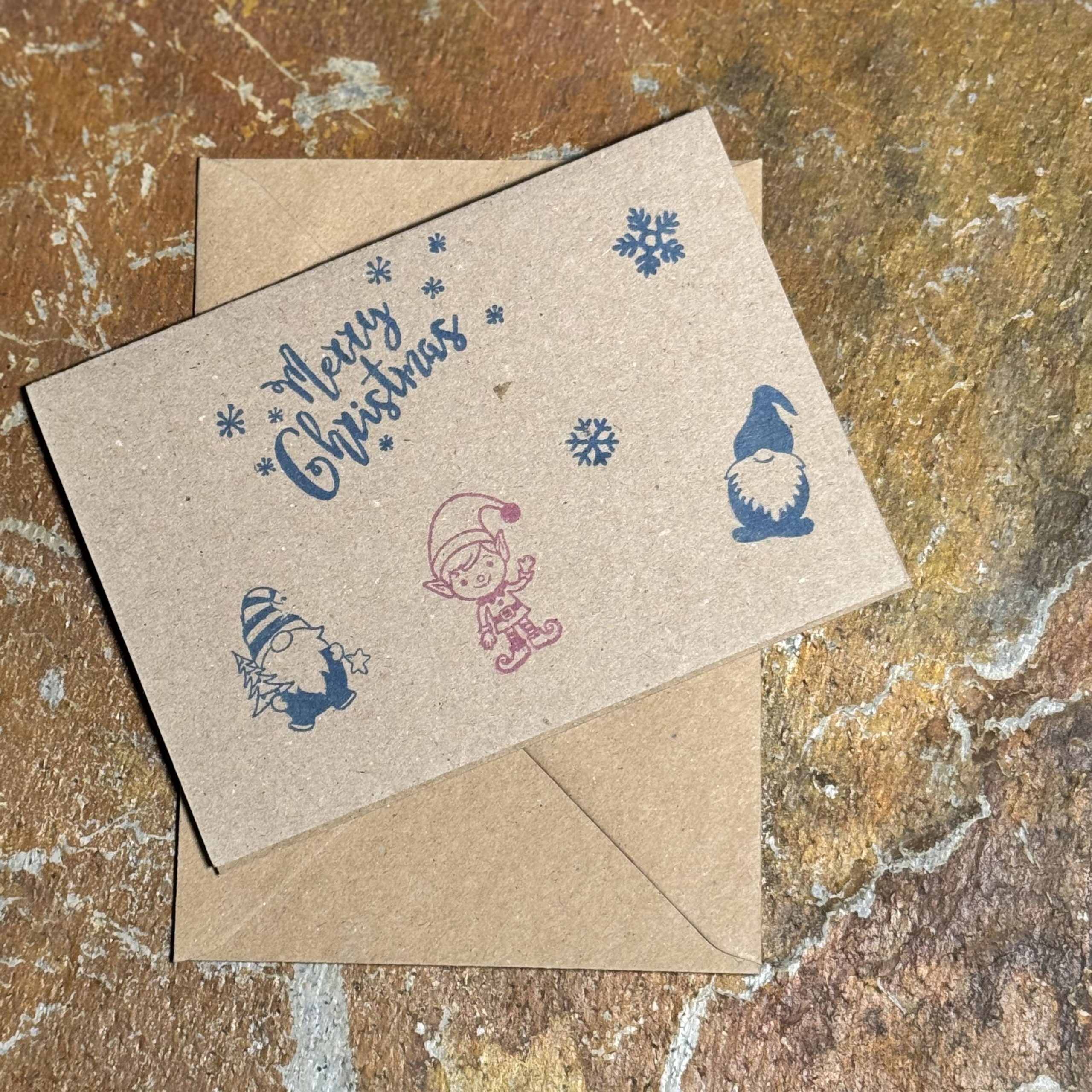 Grußkarte „Merry Christmas mit Wichteln & Elf“, gestempelt auf Kraftpapier