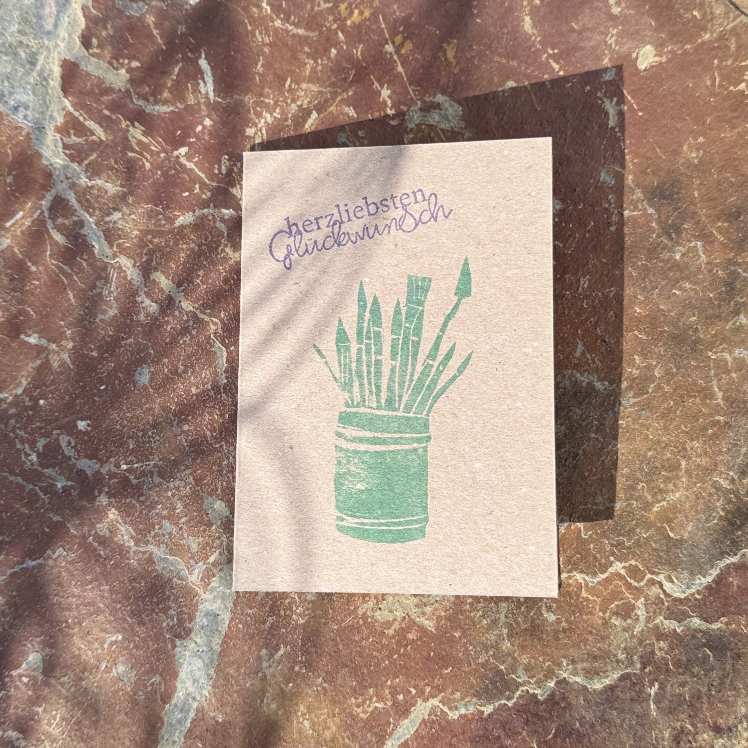 Grußkarte „Pinseltopf mit Gruß ‚Herzliebsten Glückwunsch'“, gestempelt auf Kraftpapier