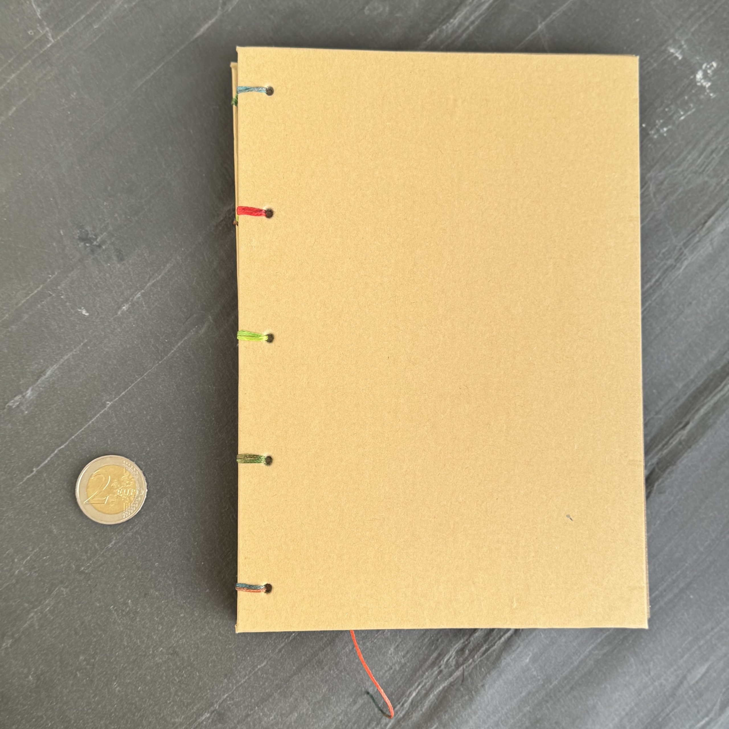 Handgebundenes Notizbuch DIN A5 mit Motiv „Kraftpapier blanko“, Buchdeckel aus Papier, 84 Seiten aus ungebleichtem Kraftpapier. Auf Wunsch mit aufgedrucktem Motiv – nach Absprache.