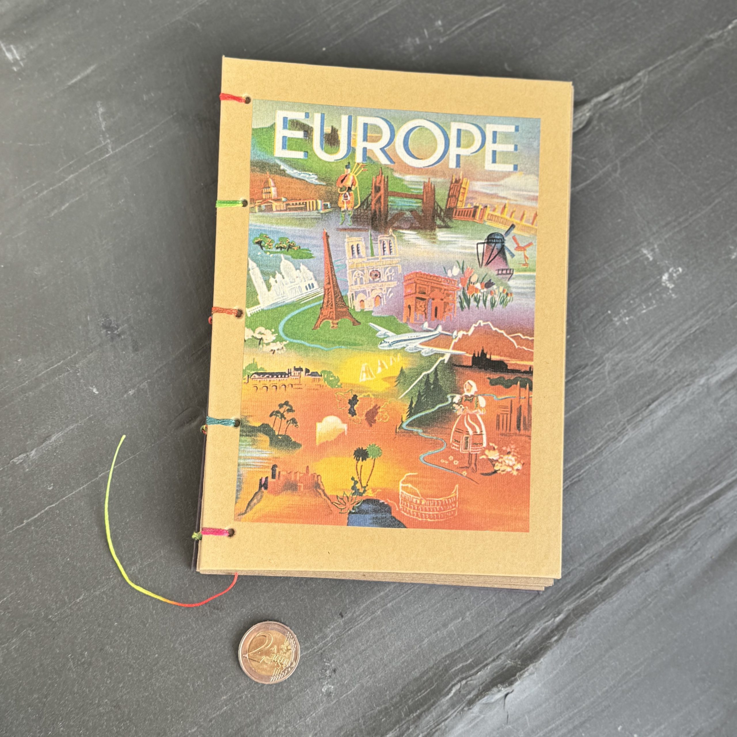 Handgebundenes Notizbuch DIN A5 mit Motiv „Vintage Reiseposter Europe“, Buchdeckel aus Papier, 84 Seiten aus ungebleichtem Kraftpapier