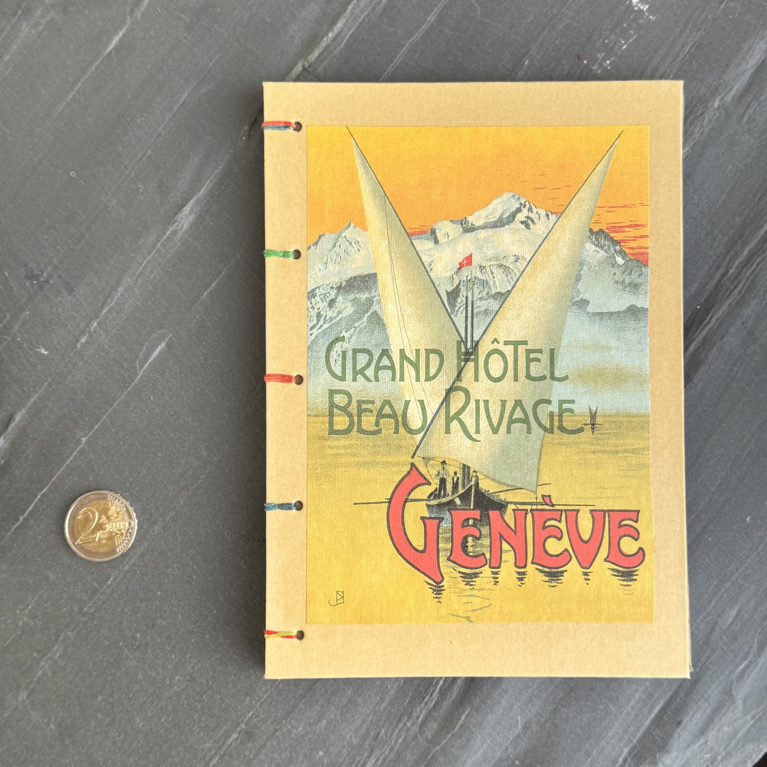 Handgebundenes Notizbuch DIN A5 mit Motiv „Vintage Reiseposter Genève“, Buchdeckel aus Papier, 60 Seiten aus ungebleichtem Kraftpapier