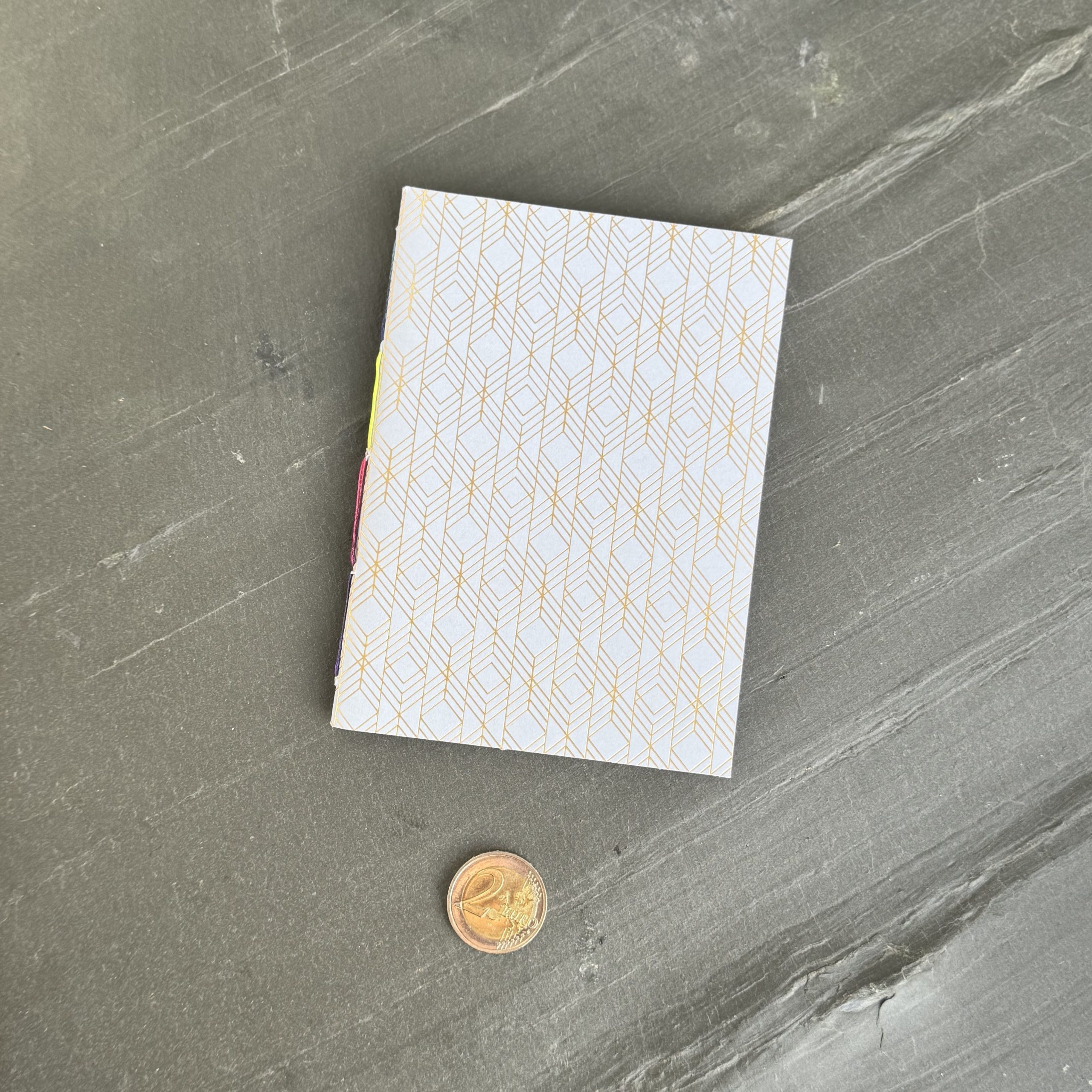 Handgebundenes Notizheft DIN A6 mit Motiv „Goldene Linien auf hellblauem Grund“, Buchdeckel aus Papier, 24 Seiten aus Skizzenpapier