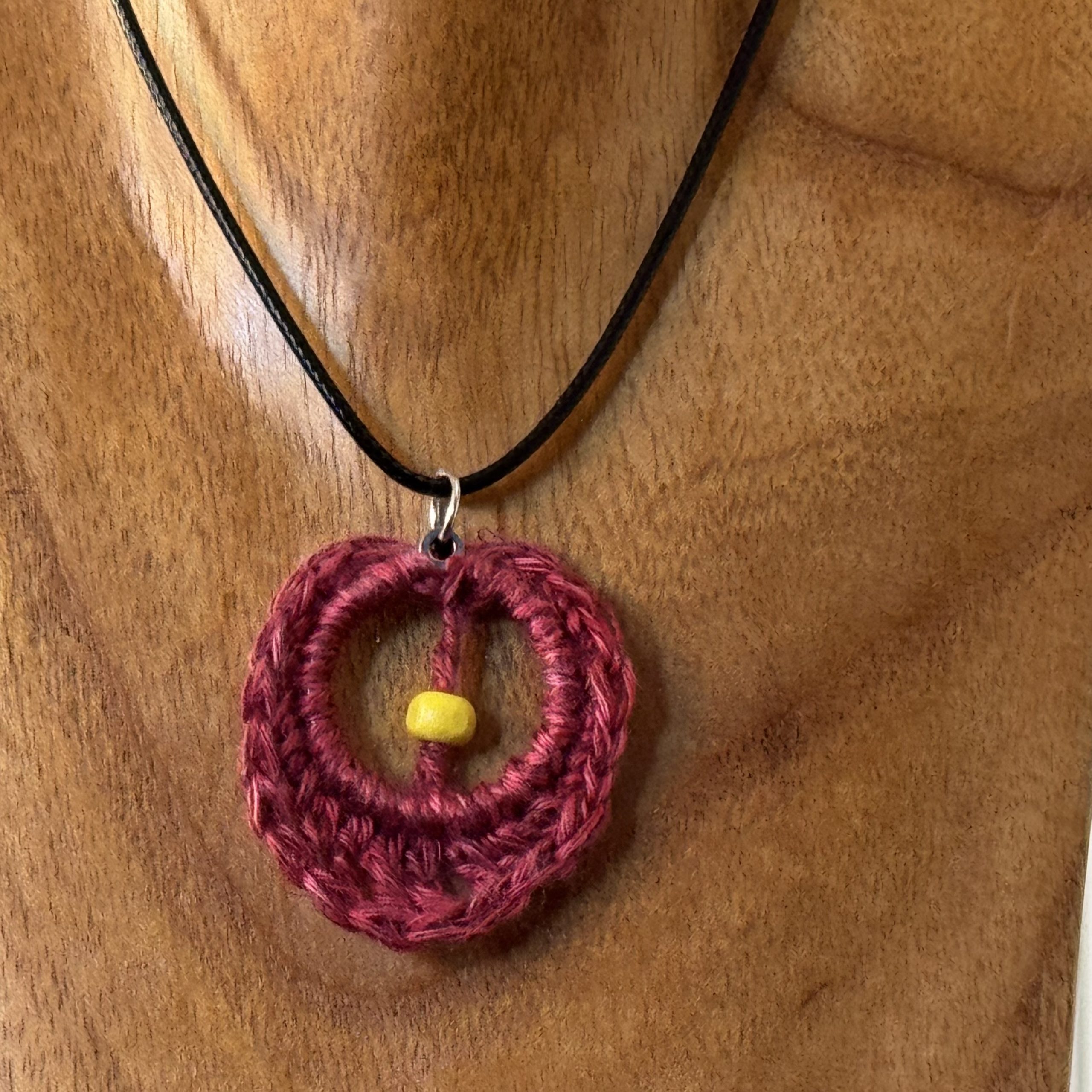 Handgefertigte Kette mit Herz-Anhänger, Kreis umhäkelt mit roter Wolle, mit gelber Perle, Kreis umhäkelt mit roter Wolle, mit gelber Perle