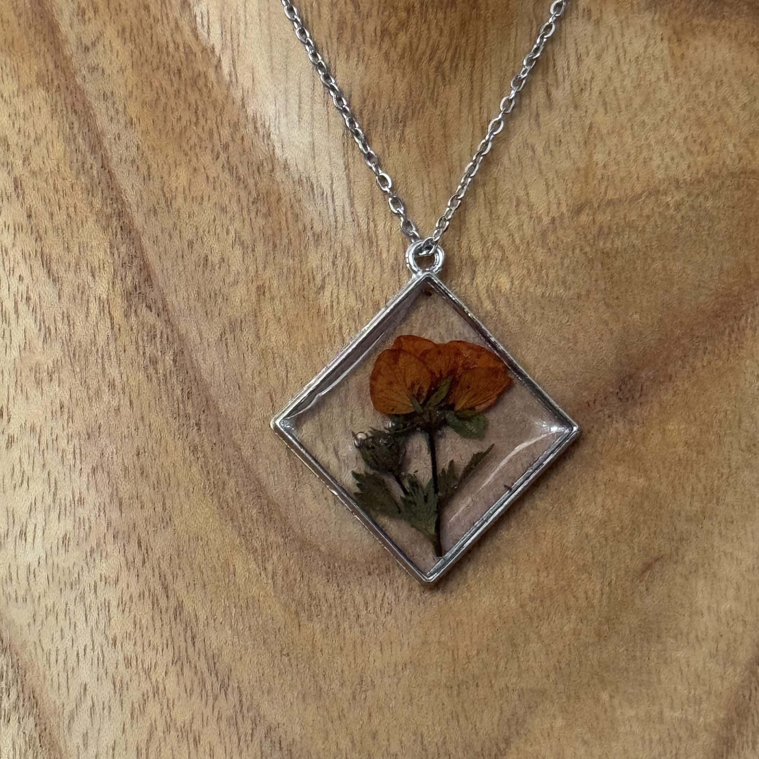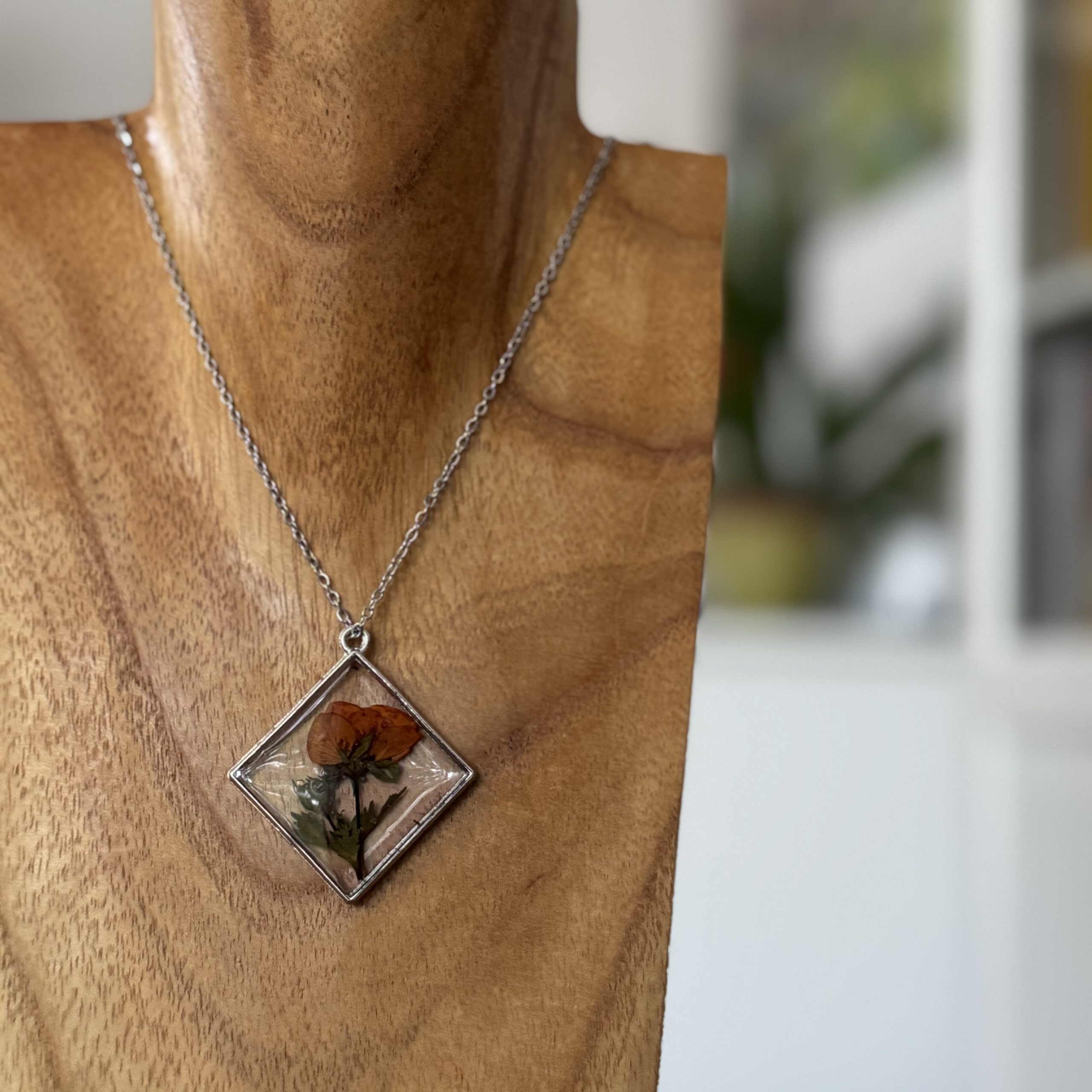 Handgefertigte Kette mit in UV Resin eingegossener orangener Trockenblume in silberfarbenem, rautenförmigem Rahmen