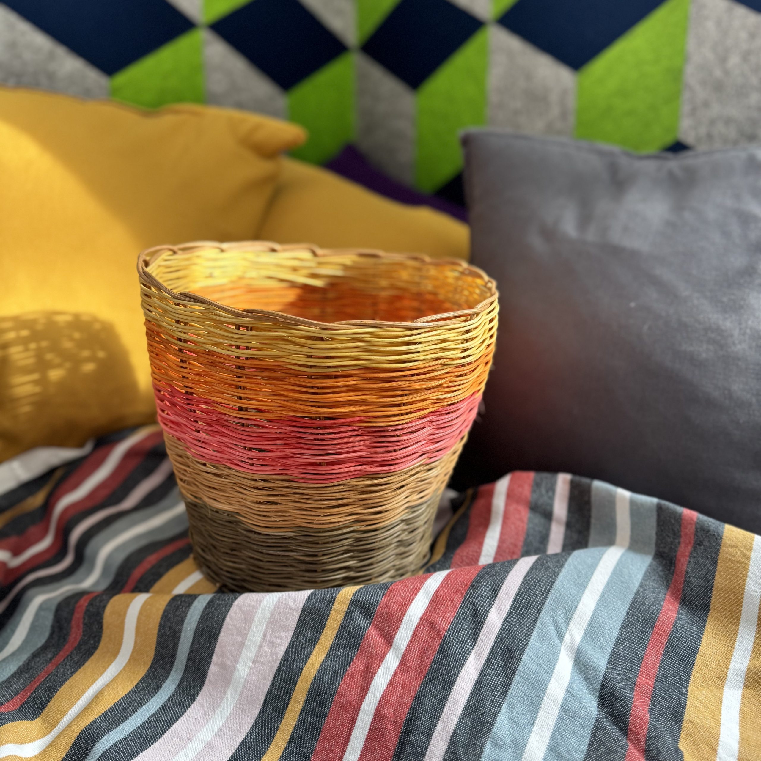 Korb aus farbigem Peddigrohr in Braun- und Rottönen