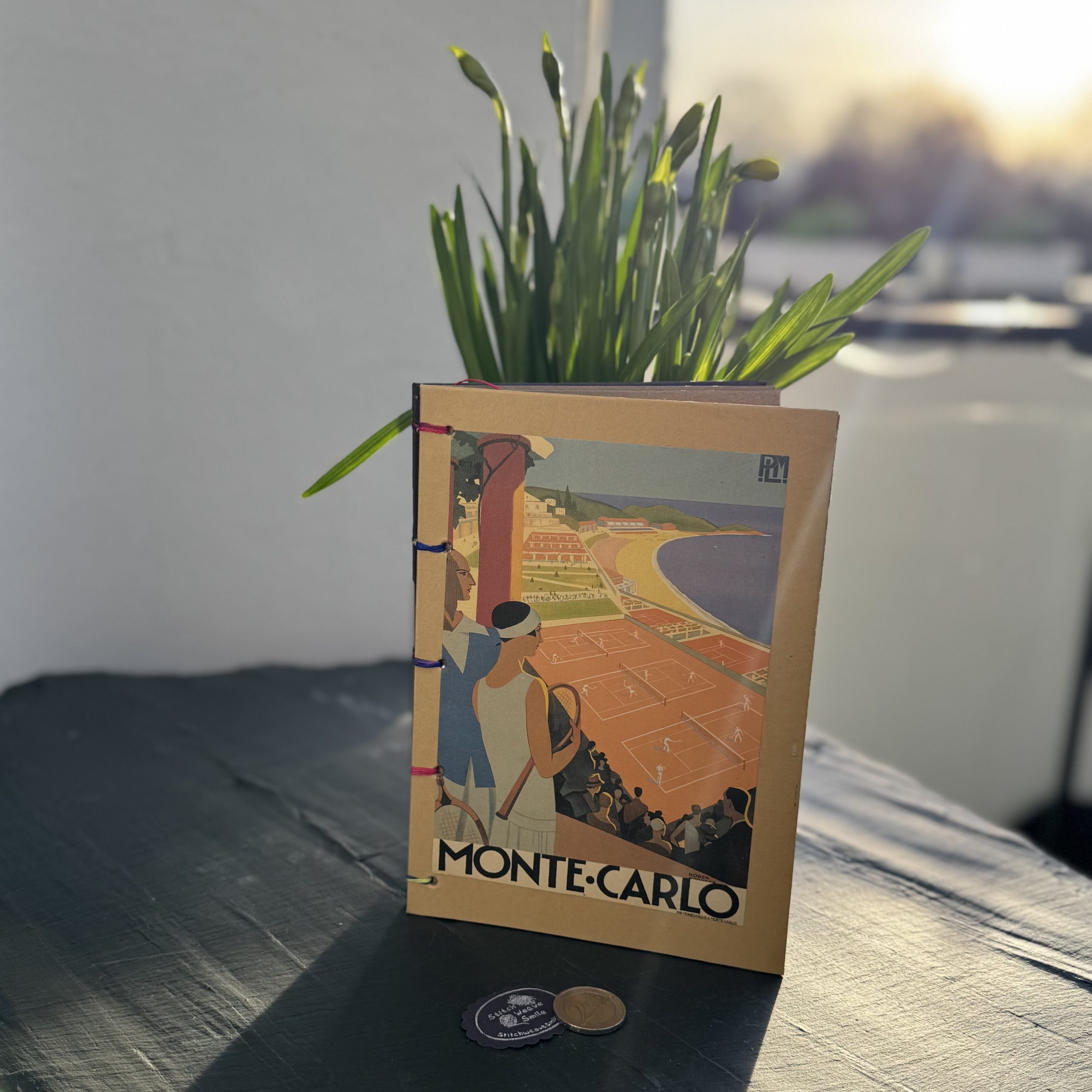 Handgebundenes Notizbuch DIN A5 mit Motiv „Vintage Reiseposter Monte Carlo“, Buchdeckel aus Papier, 84 Seiten aus ungebleichtem Kraftpapier. Gönn dir etwas! Dieses handgebundene Notizbuch ist der perfekte Ort für eure Gedanken, Geheimnisse und Erinnerungen. Buchdeckel und Buchrücken werden individuell bearbeitet und dann mit Hand Stich für Stich mit den Seiten vernäht. Sicherheitshinweise: