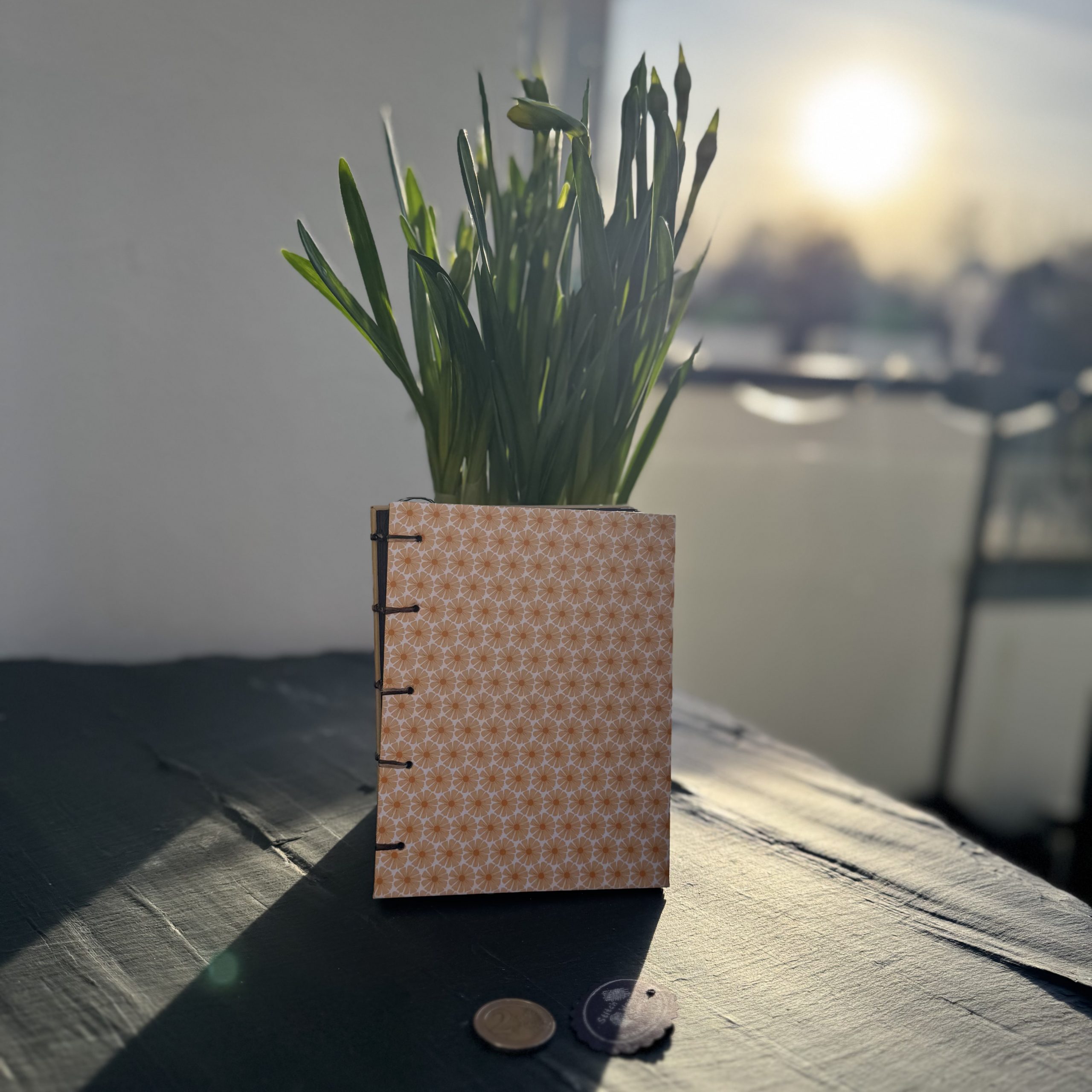 Handgebundenes Notizbuch DIN A6 mit Motiv Blumen auf gelb, Buchdeckel aus Papier, 112 Seiten aus schwarzem Kraftpapier. Gönn dir etwas! Dieses handgebundene Notizbuch ist der perfekte Ort für eure Gedanken, Geheimnisse und Erinnerungen. Buchdeckel und Buchrücken werden individuell bearbeitet und dann mit Hand Stich für Stich mit den Seiten vernäht. Sicherheitshinweise: