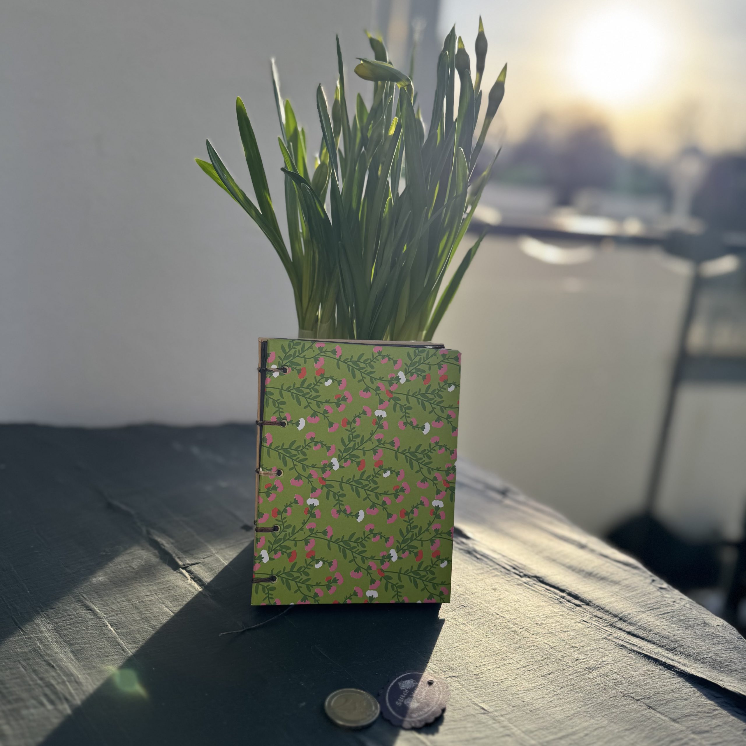 Handgebundenes Notizbuch DIN A6 mit Motiv Blumen auf hellgrün, Buchdeckel aus Papier, 112 Seiten aus schwarzem Kraftpapier. Gönn dir etwas! Dieses handgebundene Notizbuch ist der perfekte Ort für eure Gedanken, Geheimnisse und Erinnerungen. Buchdeckel und Buchrücken werden individuell bearbeitet und dann mit Hand Stich für Stich mit den Seiten vernäht. Sicherheitshinweise:
