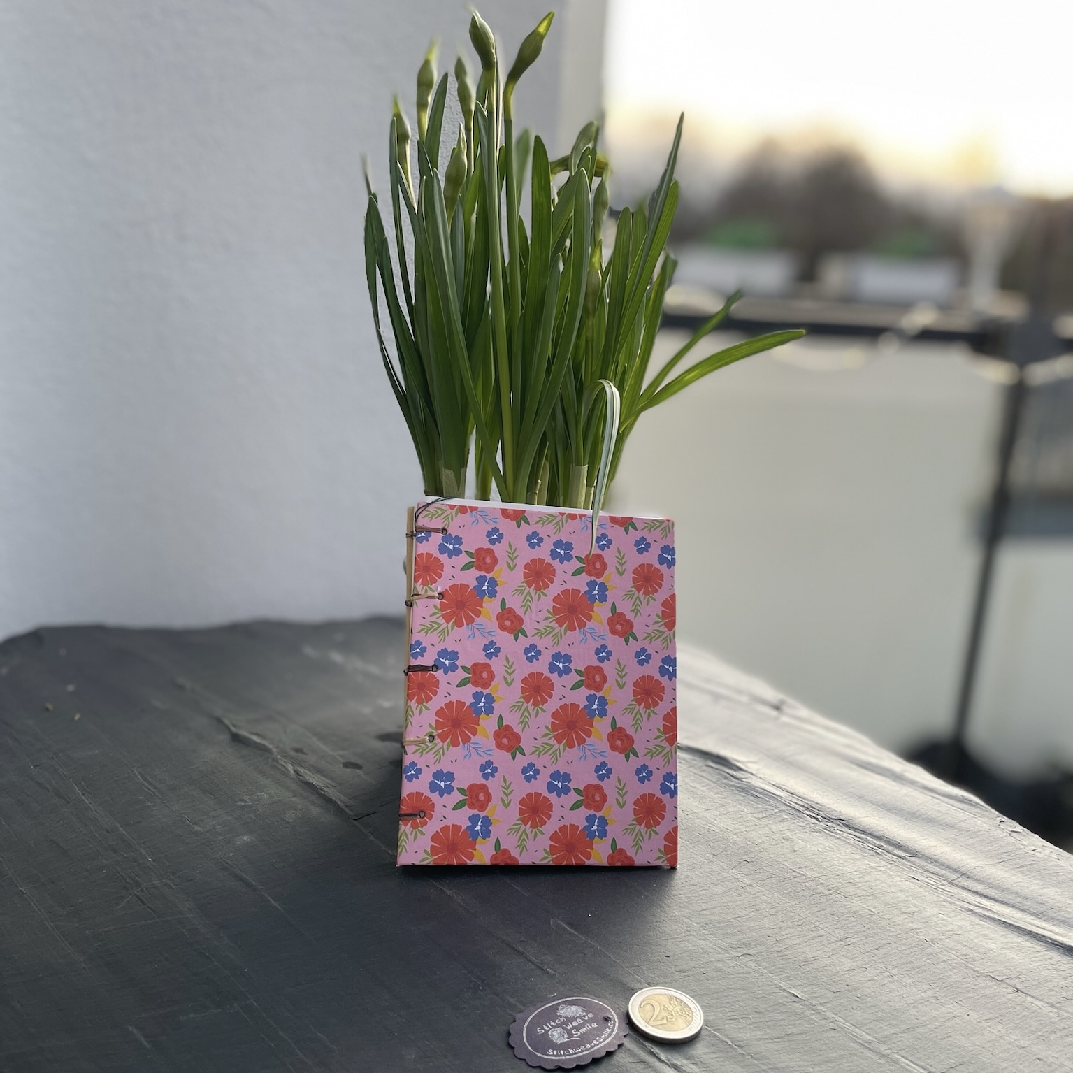 Handgebundenes Notizbuch DIN A6 mit Motiv Blumen auf rosa, Buchdeckel aus Papier, 160 Seiten aus ungebleichtem Druckerpapier