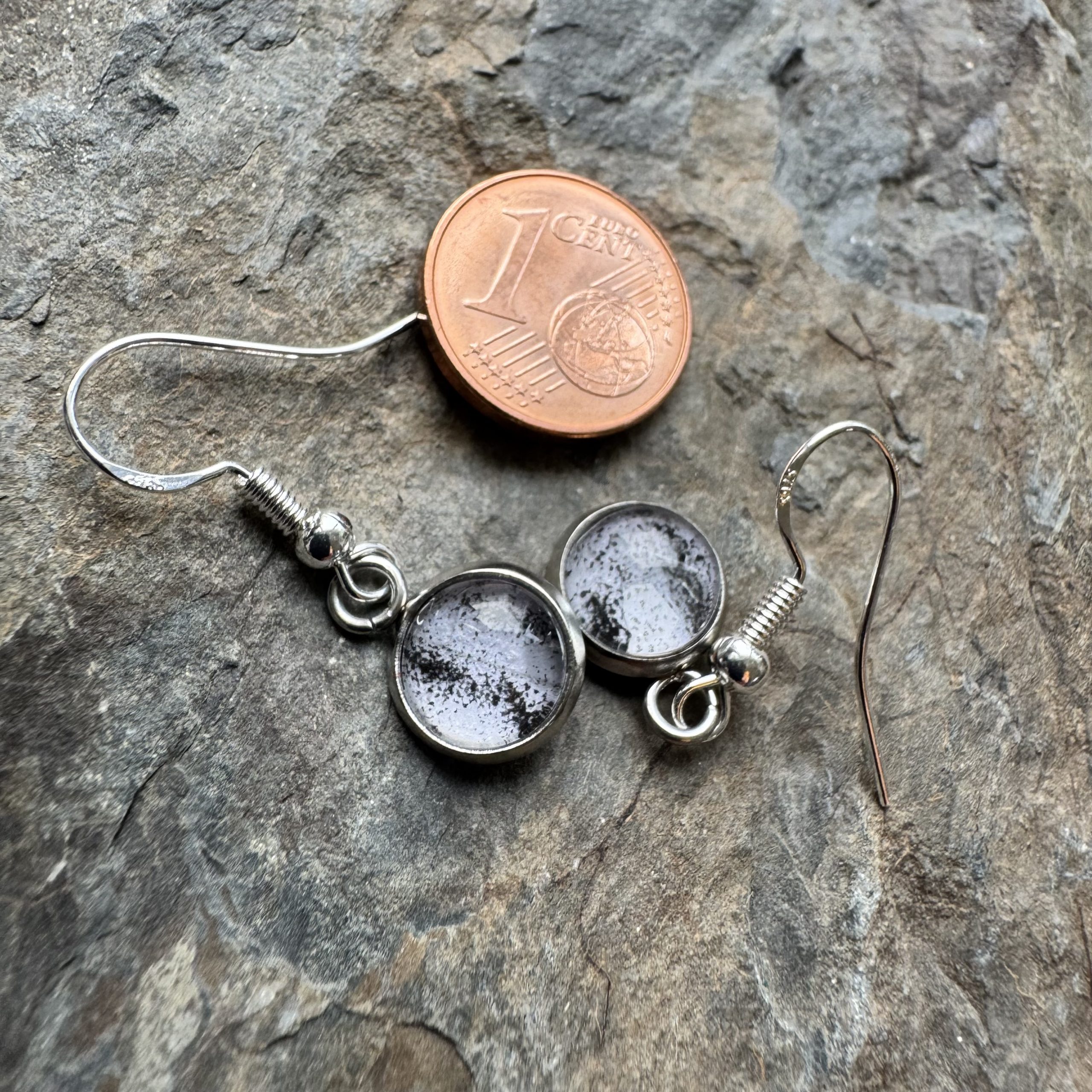 Handgefertigte Ohrringe schwarz / weiß hinter Glas-Cabochons, Muster handgedruckt. Ohrhänger silber, Lünette silber, Durchmesser 8mm. Jedes Exemplar ist ein Unikat. Angegebene Länge inkl. ca. 18mm Ohrhänger.