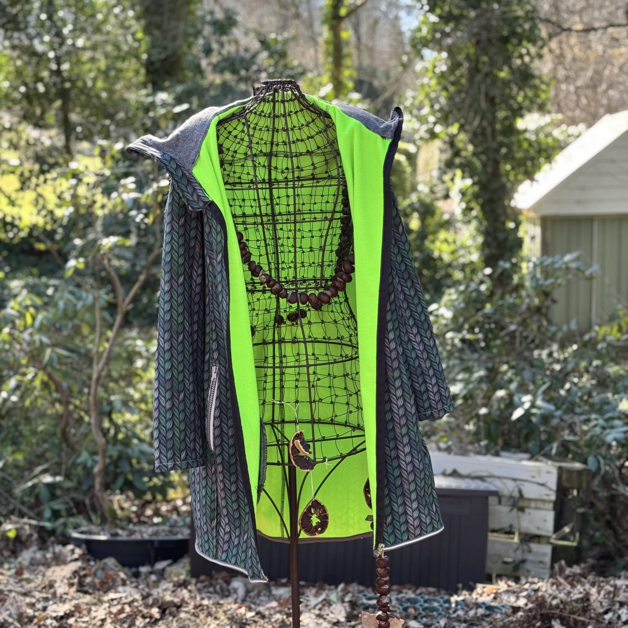 Regenjacke aus Softshell mit grünem Zopfmuster, reflektierende Elemente, Innenseite neongrün. Lieblingsstück, also leider unverkäuflich, aber es folgen bestimmt noch weitere. Gerne anfragen!