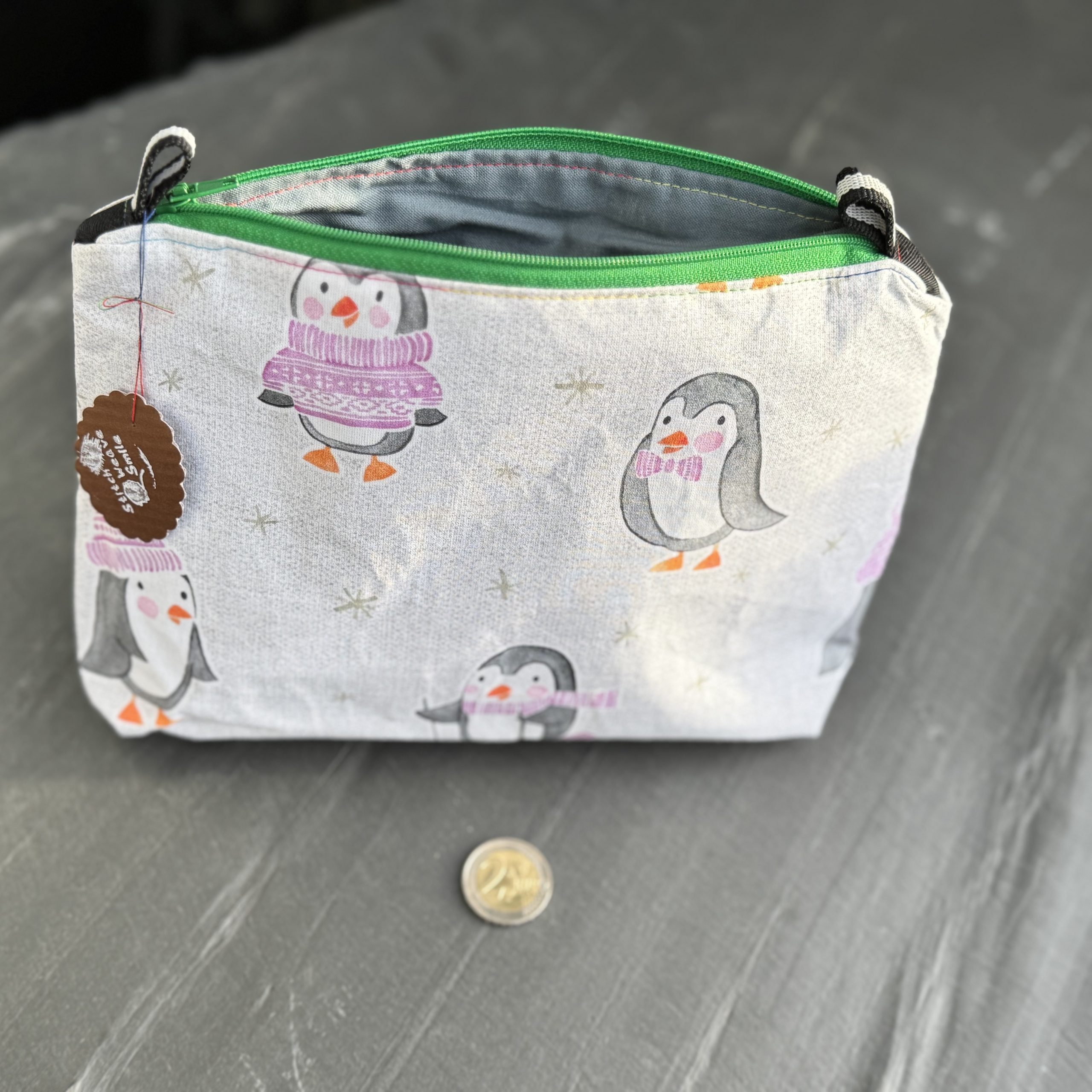 Handgefertigte Reißverschlusstasche mit Motiv Pinguine im Winter, Reißverschluss grün, gefüttert, verstärkt. Maße (LxBxH) ca.23x6x18cm