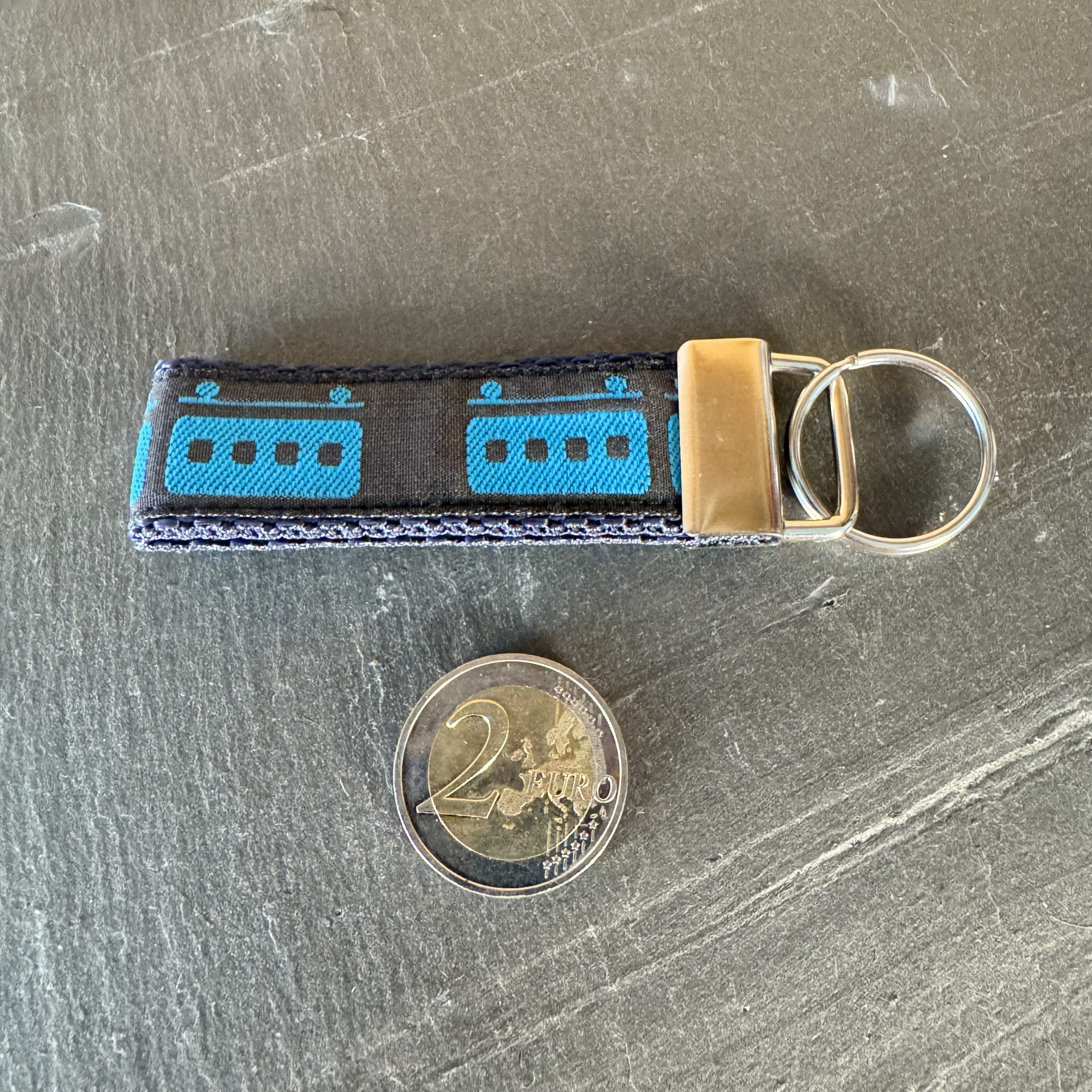 Schlüsselband „Schwebebahn petrol auf schwarz“, Gurtband dunkelblau, ca. 10 cm, inkl. Schlüsselring silber