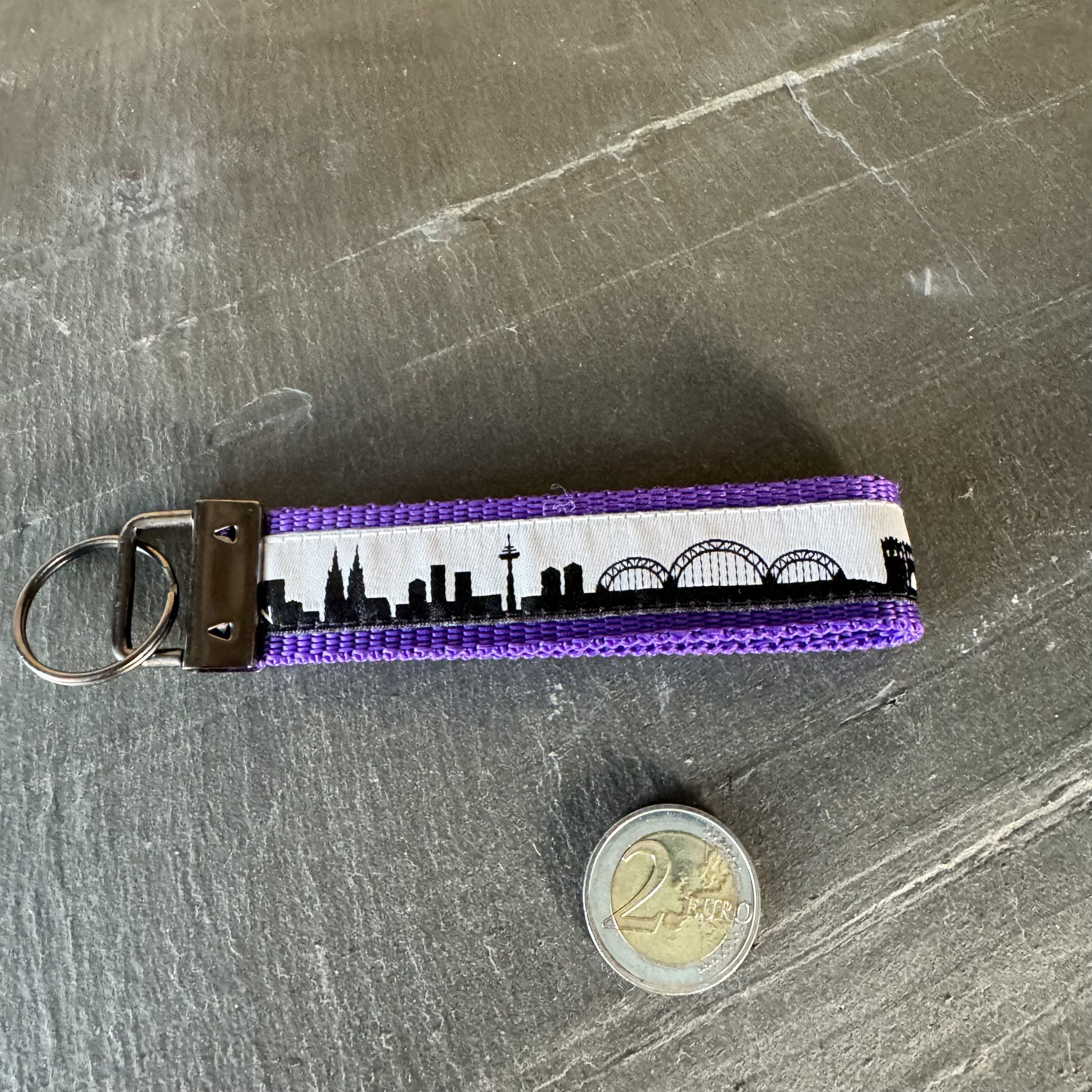 Schlüsselband „Skyline Köln schwarz / weiß“, Gurtband lila, ca. 12 cm, inkl. Schlüsselring anthrazit