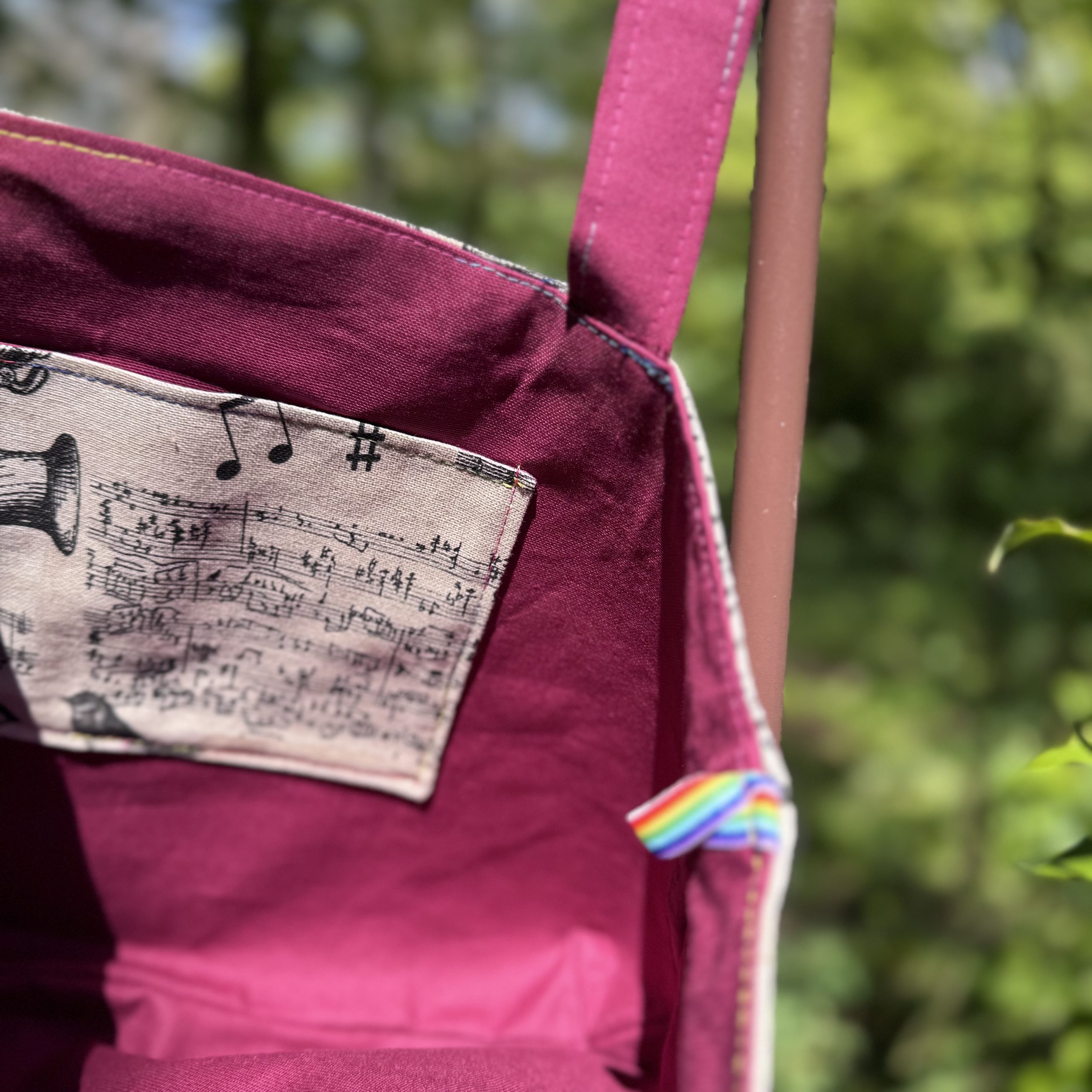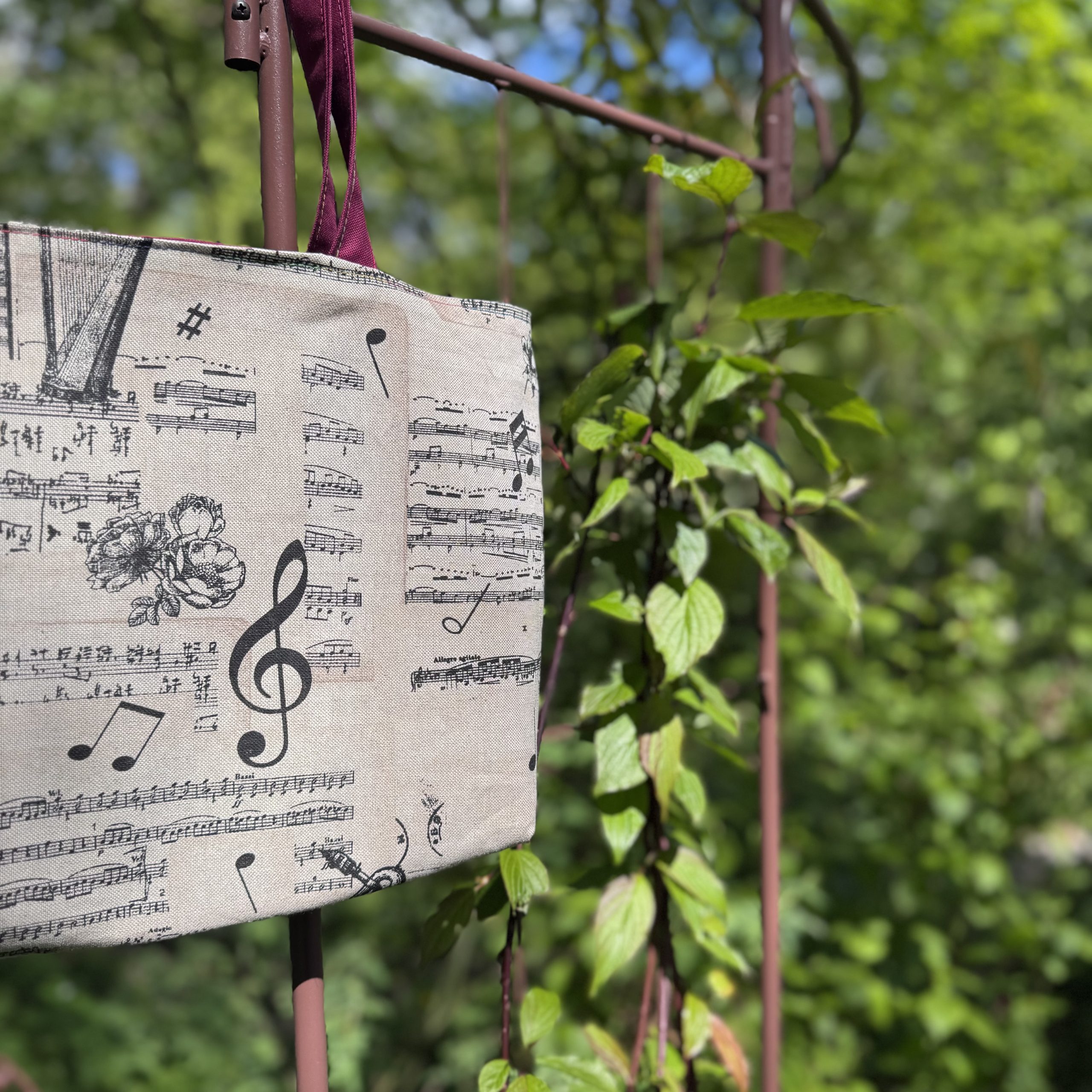 Wende-Umhängetasche aus Baumwoll-Canvas, Motiv „Noten & Instrumente“ / bordeaux, Henkel bordeaux